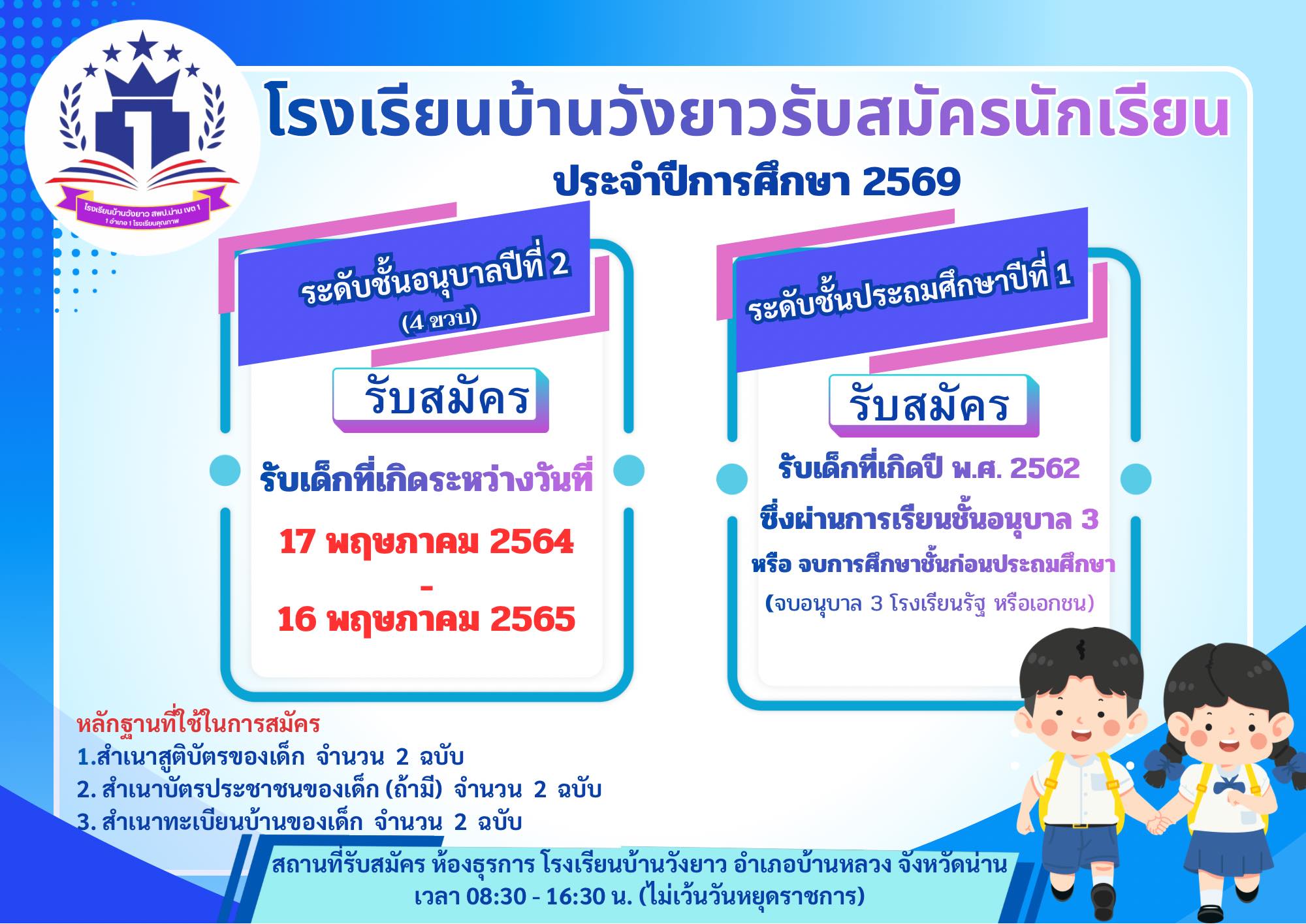 รับสมัครนักเรียน ประจำปีการศึกษา 2569 โรงเรียนบ้านวังยาวรับสมัครนักเรียน ประจำปีการศึกษา 2569 ตั้งแต่บัดนี้เป็นต้นไป ระดับชั้นอนุบาลปีที่ 2 (4 ขวบ) รับเด็กที่เกิดระหว่างวันที่ 17 พ.ค. 2564 – 16 พ.ค. 2565ระดับชั้นประถมศึกษาปีที่ 1 รับเด็กที่เกิดปี พ.ศ. 2562 […]
