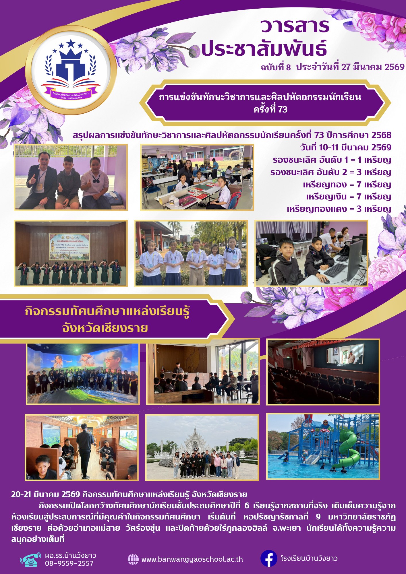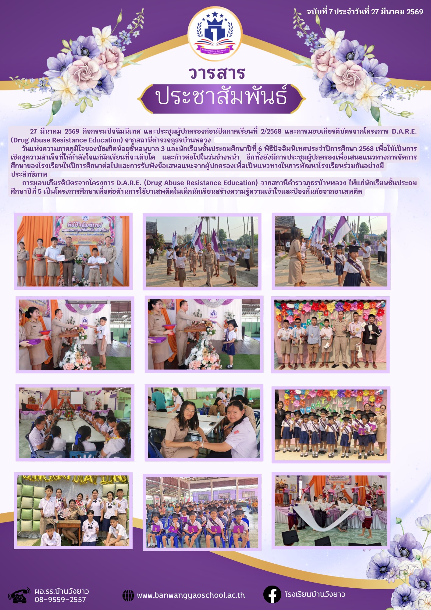 วารสารโรงเรียนบ้านวังยาว ฉบับที่ 7 เดือนมีนาคม วารสารโรงเรียนบ้านวังยาว ประจำเดือนมีนาคม ฉบับที่ 7————————————————————————– 27 มีนาคม 2569 กิจกรรมปัจฉิมนิเทศ และประชุมผู้ปกครองก่อนปิดภาคเรียนที่ 2/2568 และการมอบเกียรติบัตรจากโครงการ D.A.R.E. (Drug Abuse Resistance Education) จากสถานีตำรวจภูธรบ้านหลวงวันแห่งความภาคภูมิใจของบัณฑิตน้อยชั้นอนุบาล 3 และนักเรียนชั้นประถมศึกษาปีที่ 6 พิธีปัจฉิมนิเทศประจำปีการศึกษา […]